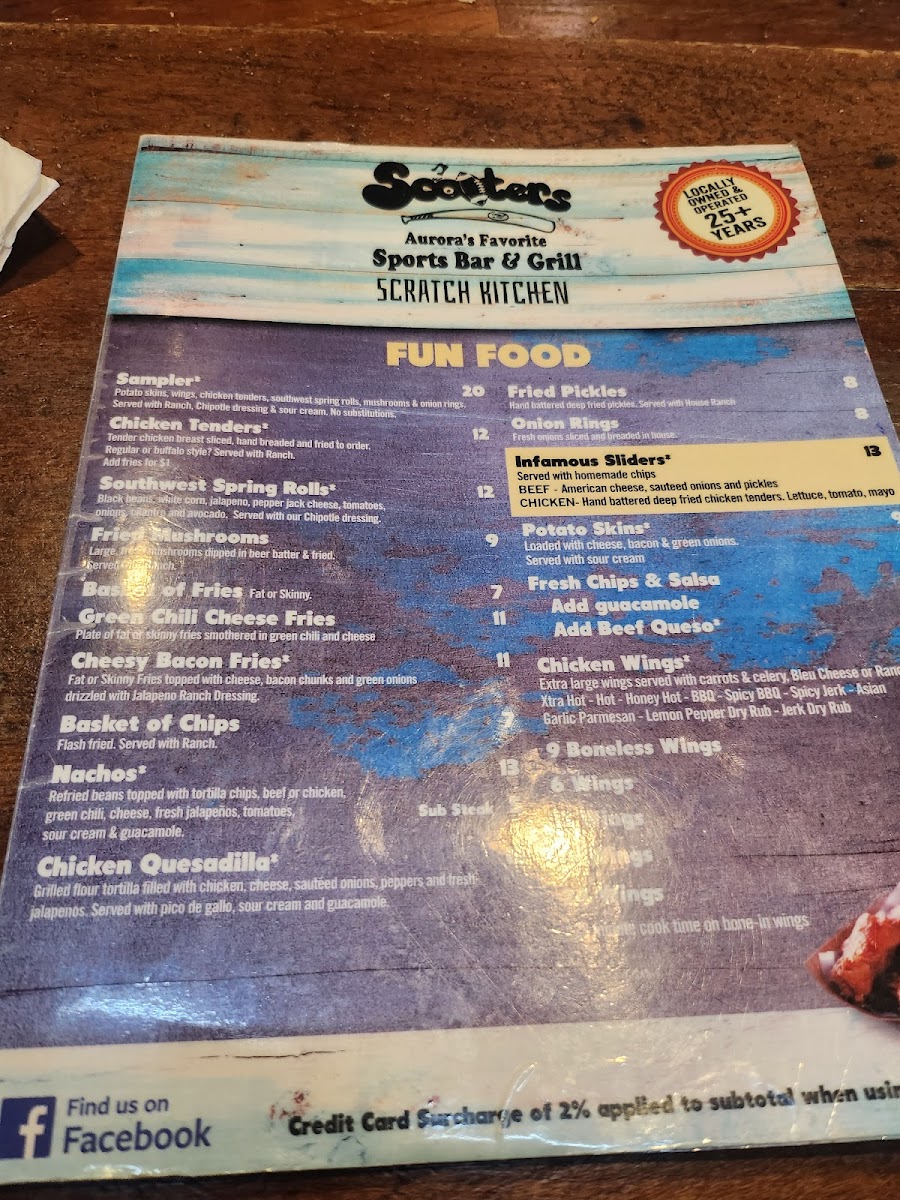 Welcome to Scooters Sports Bar & Grill, where comfort food meets a lively atmosphere! Located at 13698 E Alameda Ave, Aurora, CO, this local gem is a haven for sports enthusiasts and food lovers alike. The menu shines with an array of delicious options, from the Nachos Sampler ($23) to the iconic Chicken Fried Chicken & Gravy ($17).